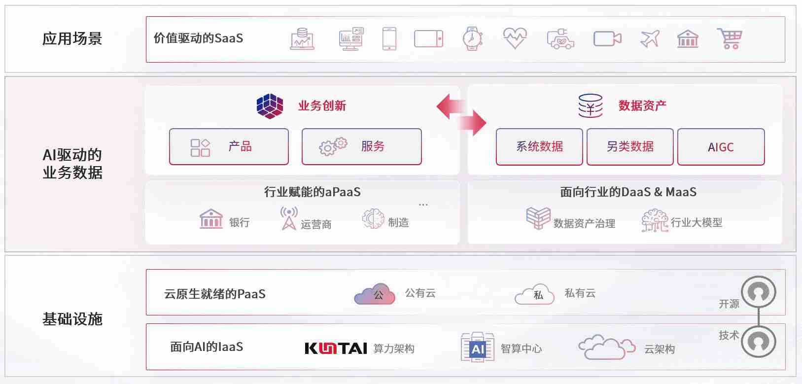 数字时代,,围绕企业数字化转型的关键要素,,MG电玩数码开创性的提出数云融合战略和技术体系框架,,着力在云原生、、、数字原生、、、AI原生和信创产业上架构产品和服务能力,,,为处在不同数字化转型阶段的快消零售、、、汽车、、、、金融、、、、医疗、、政企、、、教育、、、运营商等行业客户提供泛在的敏捷IT能力和融合的数据驱动能力,,,构建跨界融合创新的数字业务场景和新业务模式,,,,助力企业级客户建立面向未来的核心能力和竞争优势,,全面推动社会的数字化、、、智能化转型升级。。