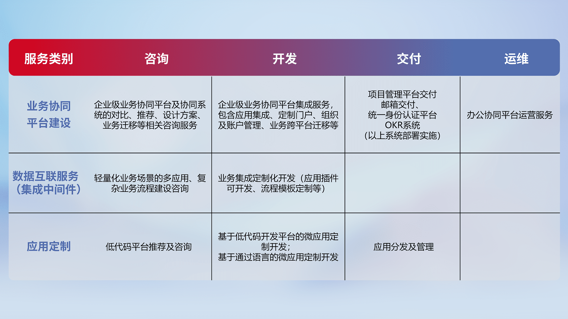 针对钉钉、、、企微、、、IDaas等平台级产品提供产品的规划、、、、方案、、、、交付、、、、定制化开发等服务,,实现如统一协同办公、、、智能客户服务、、混合会议管理、、智能数据查询、、、等业务场景,,,,实现数字化转型。。。